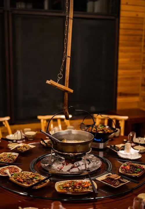 作为金寨的招牌江湖菜,每一口锅都是经典。现在在金寨一年四季皆可“吊锅”,且“一锅纳百味”,锅中的原材料从山珍拓展到海鲜,五花八门,数不胜数。三五友人围桌而坐,尝吊锅、品美酒,小火融融,锅内热气腾腾,别有一番滋味在心头。